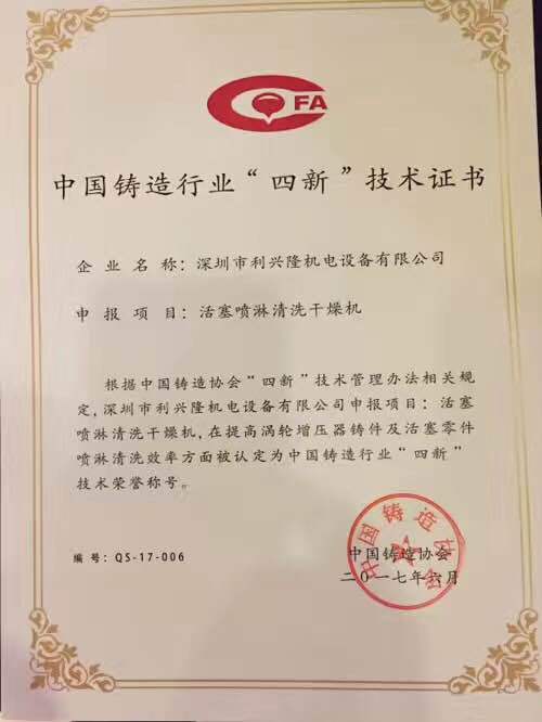 利興隆機電從100多家鑄造行業(yè)同行申報競爭中脫穎而出,獲得中國鑄造行業(yè)“四新”技術(shù)證書,全國只有10家企業(yè)獲得此殊榮,在此感謝行業(yè)的認可,辛苦利興隆人的努力付出!在未來,利興隆會繼續(xù)保持不斷地技術(shù)創(chuàng)新,和不斷進取的信念,本著“以人為本、技術(shù)創(chuàng)新、誠信服務(wù)”的經(jīng)營理念,用最好的產(chǎn)品,為廣大用戶制造出最好的,最專業(yè)的清洗設(shè)備!